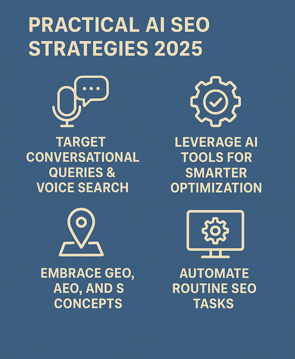 Integrate Generative Engine Optimization (GEO), Answer Engine Optimization (AEO), and Search Generative Experience (SGE) into your content to capture AI-driven search traffic.